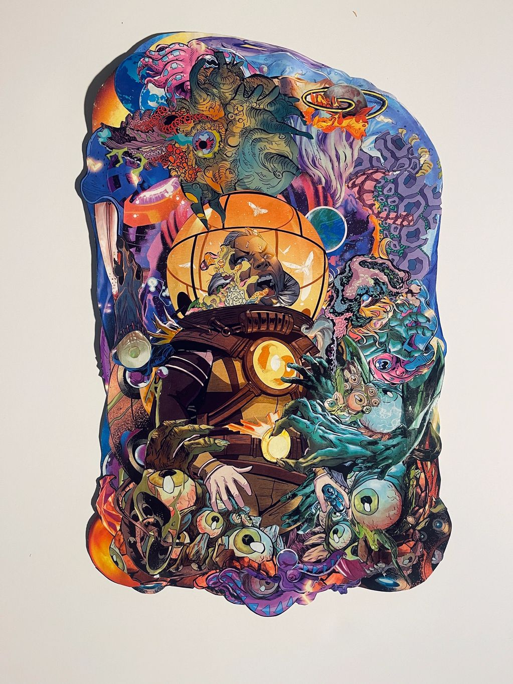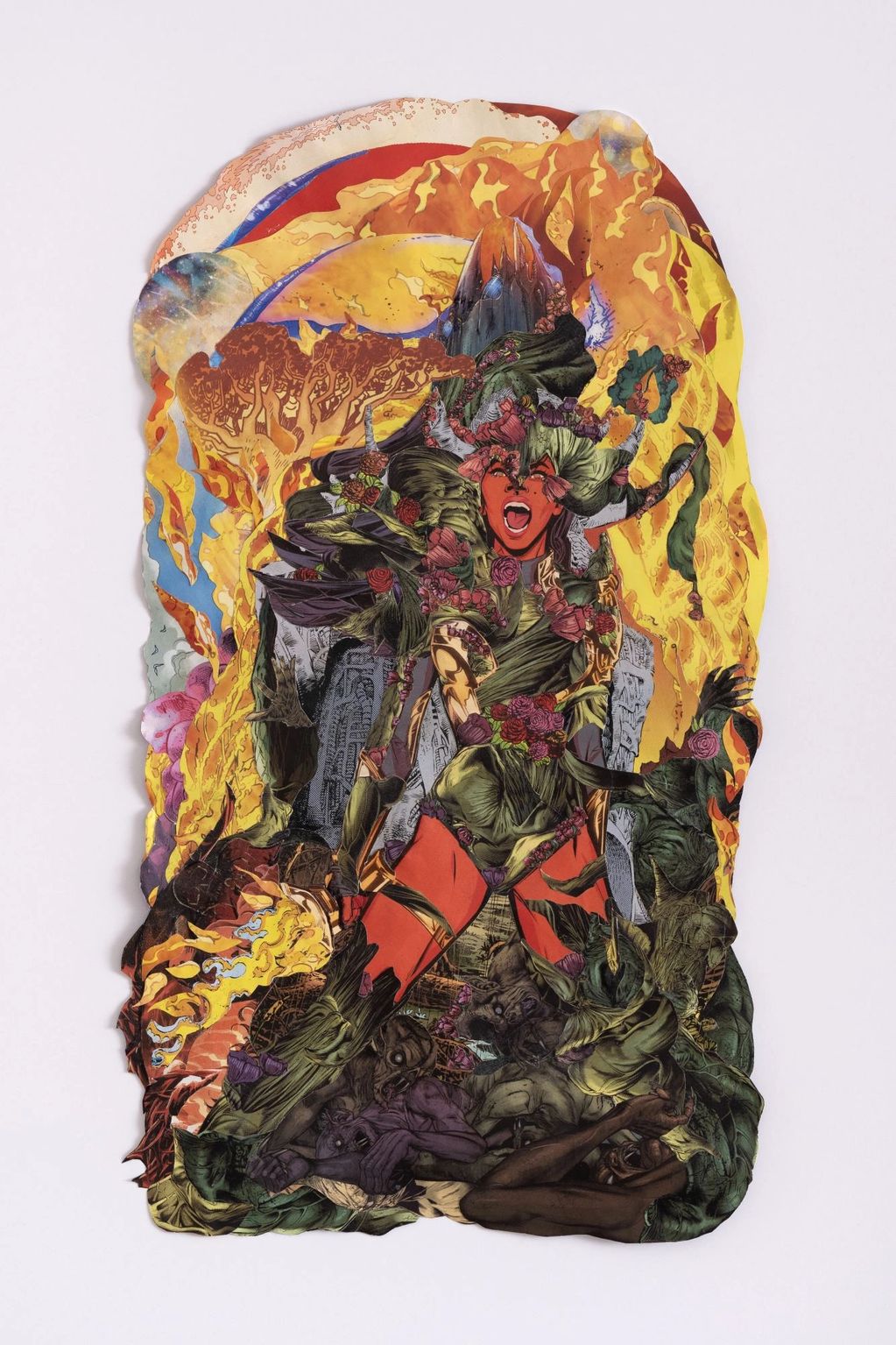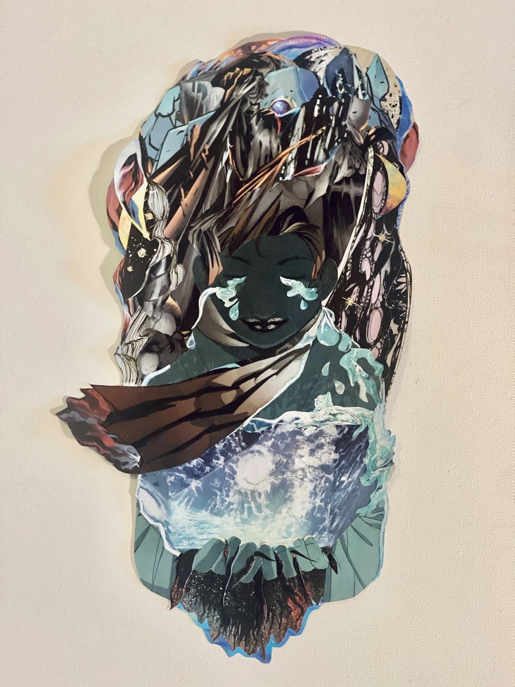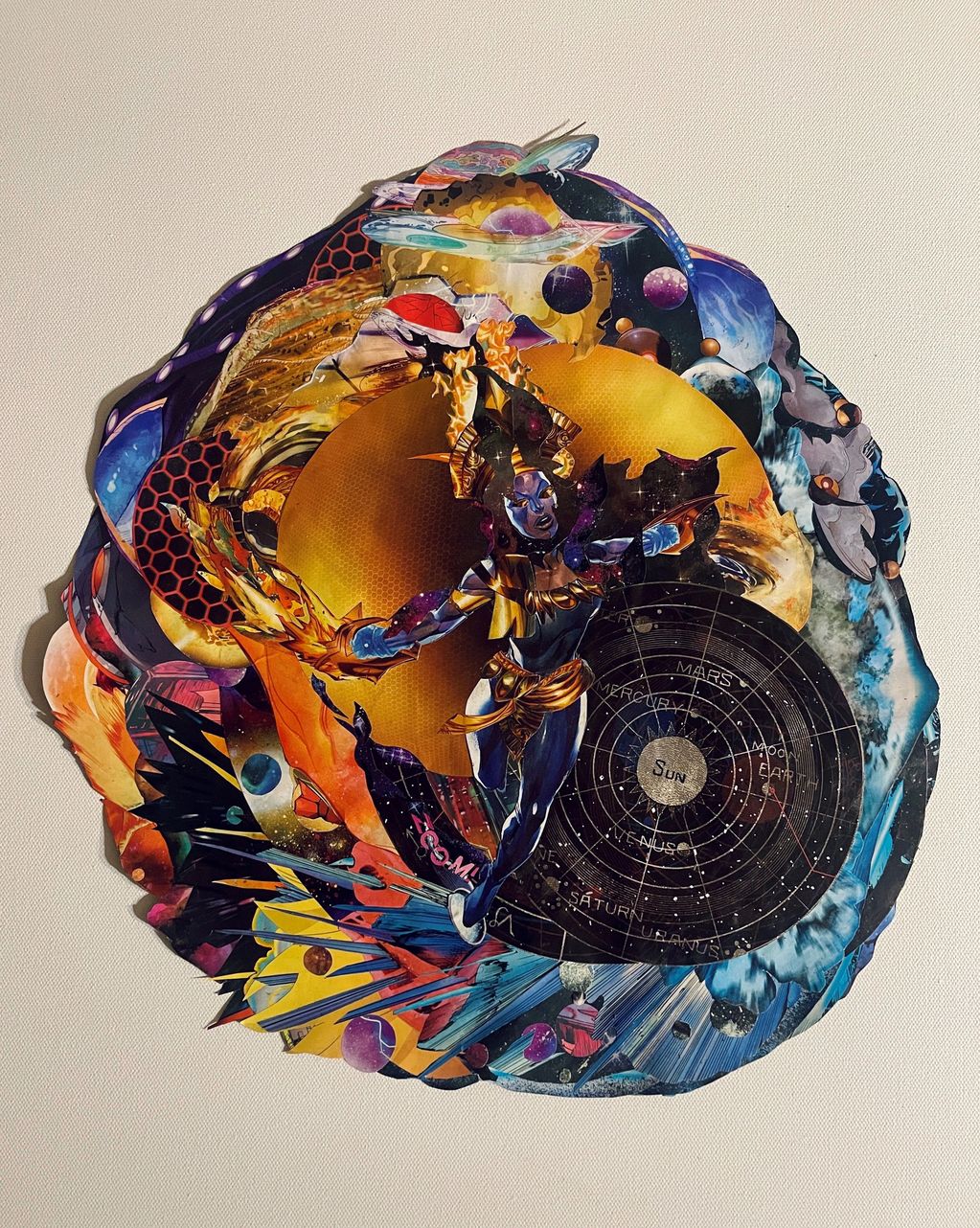 Each of my collages embodies my experiences and shines a light on the unique struggles of women of color navigating our identities within a white male-dominated society. My artwork provides both representation and reflection, extending an invitation to a “Brave Space”- a sanctuary, encouraging viewers to safely identify with, acknowledge, feel, and uplift shared experiences, and amplify voices often unheard and/or overlooked in the art world. Traditional boundaries are transcended through a meticulous fusion of materials that are built without using a substrate, resulting in collaged universes, that touch on pop culture, spirituality, resilience, and the divinity found in womanhood. Through an interlocking and weaving process of deconstructed materials sourced from comic books and graphic novels, new dimensions are added to the creation of collaged paper sculptures, inviting viewers to explore intricate new narratives that address societal issues like racism and sexism, underscoring the challenges faced by marginalized groups. The floating display adds depth to the profound spiritual and whimsical artworks, each infused with intentionality and meticulous attention to detail, drawing viewers into a world of color, meaning, and magic.